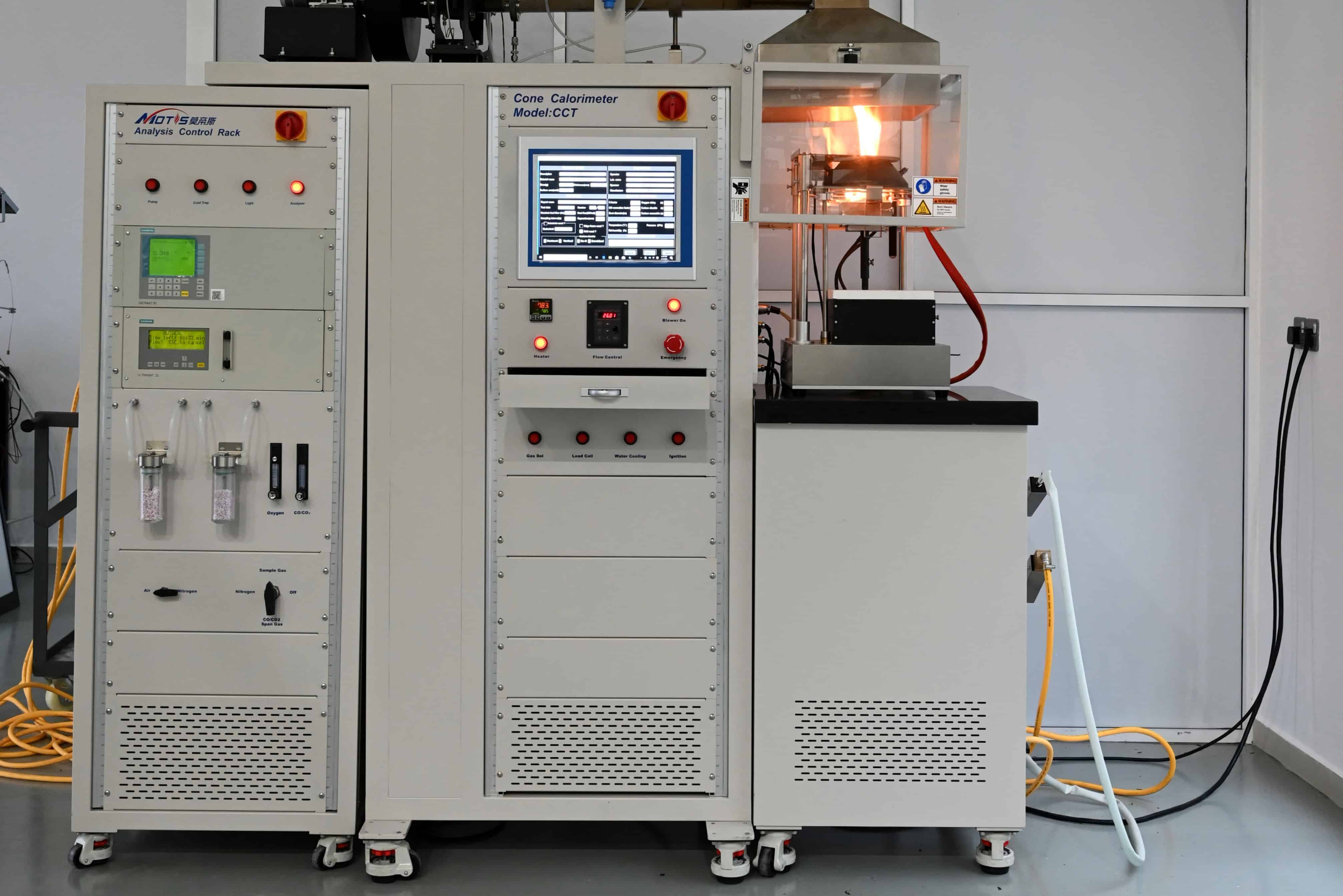 The Cone Calorimeter is an advanced apparatus that evaluates how materials ignite and burn under controlled heat flux. It assesses the fire performance of building materials by measuring key parameters such as Ignition Time, Heat Release rate, Mass Loss, and other properties relevant to fire characteristics. These metrics are crucial for understanding how materials behave when exposed to fire, providing essential data for fire safety analysis and material development.